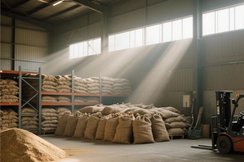 入库前必须干燥:玉米、小麦等谷物原料,入库前务必晒干或烘干,水分含量必须控制在13%以下。你可以用牙咬一下玉米粒,如果感觉硬脆、断面光滑,就说明差不多了。仓库必须防潮:仓库地面要做防潮处理(比如垫上木板、塑料薄膜)。饲料袋不要直接堆在地上,一定要用托盘垫高,离墙至少20厘米,保证底部通风。