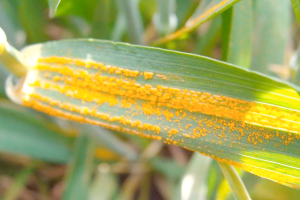 后期病斑会变成黑色(冬孢子堆),用手摸叶片,手指上会沾上黄粉。