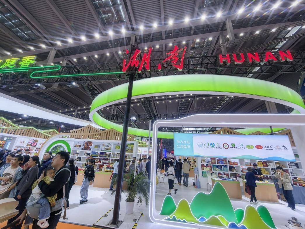 湖南展团以“洞庭香”为主题,打造了一个360平方米的特色展区,集结了30余家品牌企业,带来了200多种独具风味的“湘字号”农产品。从米面粮油到果品蔬菜,从豆制品到肉类禽蛋,从茶叶中药材到酒水饮料,琳琅满目的产品充分展现了湖南农业的丰富多样性。湖南农产品究竟有多受欢迎?展馆内川流不息的人群给出了答案。安化黑茶、湘西腊肉、衡阳米粉等特色产品在开展首日就销售一空,湘西香肠腊肉等产品不得不多次调货补货。不少湖南特色农产品通过这次展会建立了长效订单合作,为后续持续开拓市场奠定了坚实基础。