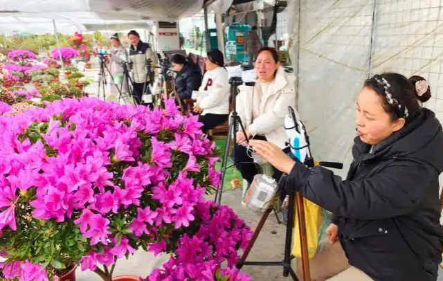 中午时分,颜集镇堰下村这个闻名全国的“淘宝村”开始热闹起来。在幸福花海电商直播基地内,仲维国正忙碌地指导主播养花卖花技巧,同时细心照料着那些盛开的三角梅。