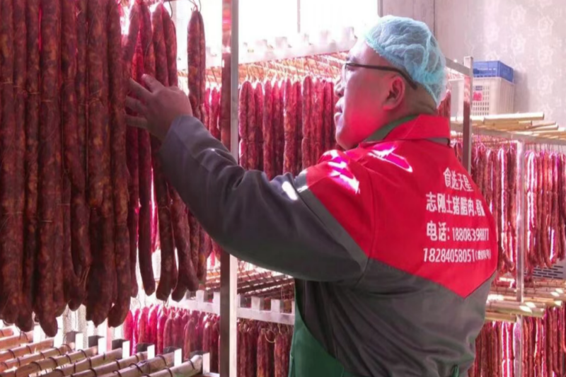 2015年6月,志刚家庭农场正式成立。但创业之路并非一帆风顺,生猪市场价格波动让罗志刚意识到单一养殖的风险。“猪价不稳定,必须把产品深加工,提升附加值。”他主动求变,注册成立四川省苍王山农业有限公司,打造“食选天星”品牌,将优质畜禽产品转化为多元化的深加工制品。罗志刚带领团队深耕产品研发,推出腌腊、风干两大系列产品,腊五花、腊猪蹄、腊排骨、风干鸡、风干鸭等产品相继问世。“眼下正是腊肉销售旺季,平均日销六七百斤,高峰期能到八百斤,订单主要来自成都、上海、北京这些大城市。”罗志刚擦着额头的汗珠,欣慰地说道。昔日的“土货”如今成了都市人青睐的“山珍”。