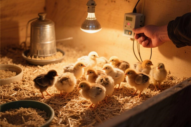 第一周要特别注意刚出壳的雏鸡体温调节能力差,第一周需要35-33℃的环境温度。温度计要挂在离垫料5厘米处,与雏鸡背部同高。观察雏鸡行为是最可靠的测温方法:如果雏鸡均匀分布、活动自如,说明温度合适;如果挤在一起、发出尖叫声,说明太冷;如果远离热源、张口喘气,说明太热。
