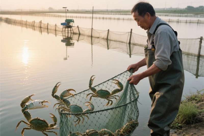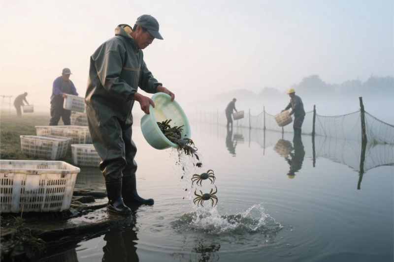 调节温差是第一步。蟹苗运到后,不要急着投放。先把装蟹苗的箱子或袋子放在池边阴凉处,用池水慢慢淋洒。这个过程至少要持续15-20分钟,让蟹苗逐渐适应池塘水温。试水环节不能少。正式投放前,先取少量蟹苗放在池塘的网箱里试养24小时。观察成活情况,如果没问题再大批投放。