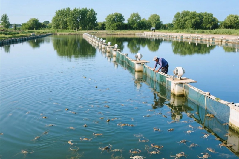 选对了苗,就等于成功了一半。优质蟹苗(通常指二期到三期幼蟹)看起来肢体完整、活力强、反应敏捷、体表光洁没有附着物。最好选择本地化培育的苗种,适应性更强。放苗有讲究。首先要“试水”:取一些池水放入少量蟹苗,观察24小时,存活率达标再大批放养。放苗时间通常选在春季水温稳定在18℃以上时,具体时间依据当地气候调整。放苗应选择晴朗无风的早晨或傍晚,避免中午高温。每亩放养密度建议在1500到2500只,具体根据池塘条件和管理水平调整。放苗时,先将苗袋漂浮在池水上适应水温,15分钟后再打开袋口,让蟹苗自行游入水中。