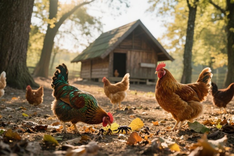 这是夏季林地养鸡最突出的健康问题。体内寄生虫:鸡在林地觅食,容易吞食感染性虫卵。蛔虫、绦虫等肠道寄生虫会抢夺营养,导致鸡消瘦、贫血、产蛋下降。必须制定并严格执行定期驱虫程序,建议在入夏前和夏季中期各进行一次广谱驱虫(如使用阿苯达唑、伊维菌素等)。