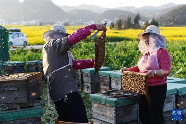 浪漫花海还催生出甜蜜的“蜂产业”。每年春天,全国20多个省份的养蜂人带着数万群蜜蜂汇聚罗平。全县2000多户蜂农年产蜂蜜2000余吨,形成从原蜜到加工品的完整产业链,2022年至今产值超过2.4亿元。“罗平的‘油菜花经济’,已不再是单一景观,而是一张交织旅游、油菜籽加工、蜂产品等富民产业的立体网络。”罗平县委书记许韶发如此总结。