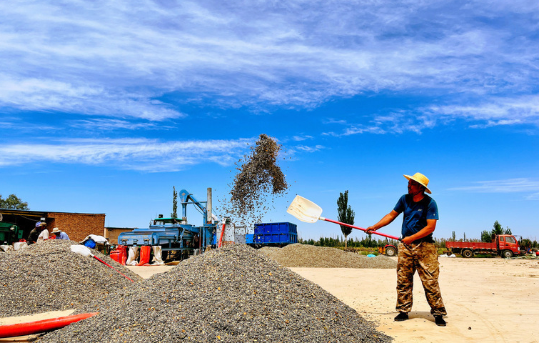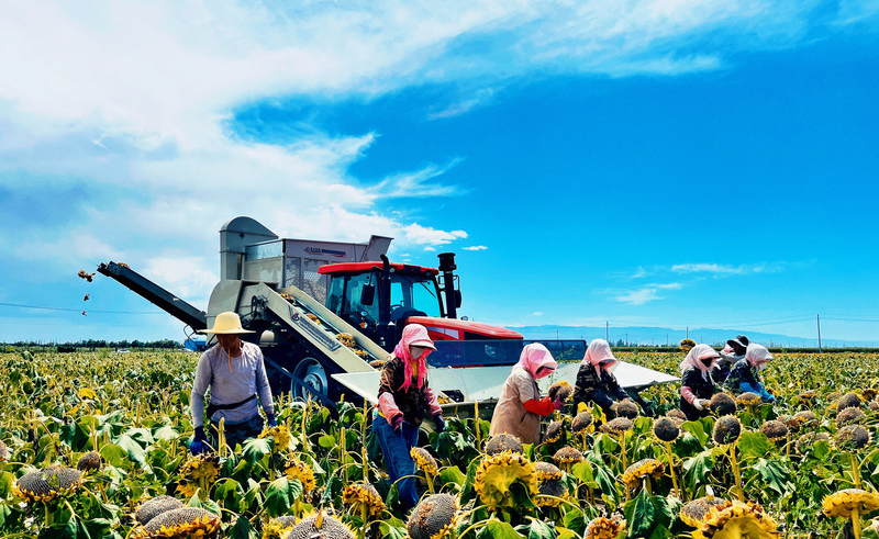 丰收的喜悦不仅体现在产量上,更实实在在地反映在了农民的收入账上。葵花采收期间,脱粒机的轰鸣声、运输车辆的引擎声在田间此起彼伏,吸引了周边大量村民来这里打工。58岁的李桂兰就是其中之一,她家距离种植区不到两公里,每天早上她都会准时来到地里,跟着大家一起晾晒葵花、装运货物。“在家门口就能挣钱,一天能挣150块,还能照顾家里老人孩子,这日子越过越有奔头了。”李桂兰一边把葵花籽摊开晾晒,一边笑着说。据了解,仅巴润霍德嘎查的葵花种植产业,今年就带动了周边3万余名群众实现季节性就业,人均增收超过5000元。