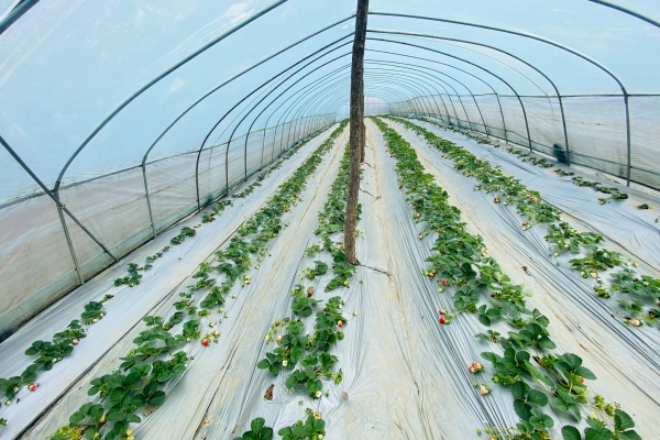 •旧彩钢瓦挡风:园边立一排2米高旧瓦,相当于给草莓园穿了件“风衣”,风障内温度能提高1℃~1.5℃,还能重复用好几年。