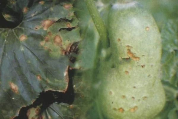 叶片出现黄褐色圆形病斑,果实上产生圆形凹陷斑,有粉红色粘状物。