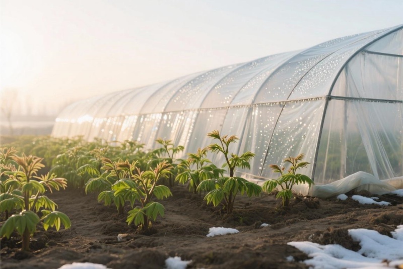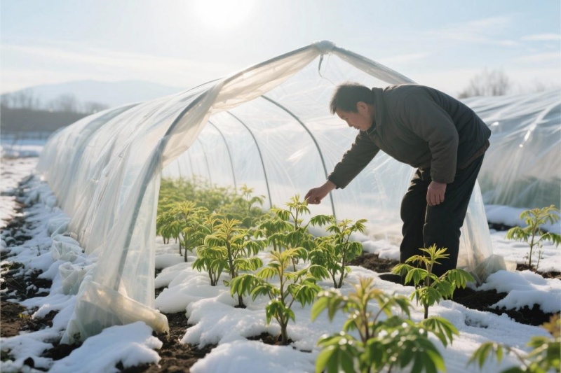 如果是成片的香椿苗,可以在苗圃的北面和西面用玉米秆、高粱秆或者塑料布做个防风障。高度1米左右就行,能大大减少寒风直接吹到苗子上。这个方法在北方特别管用。