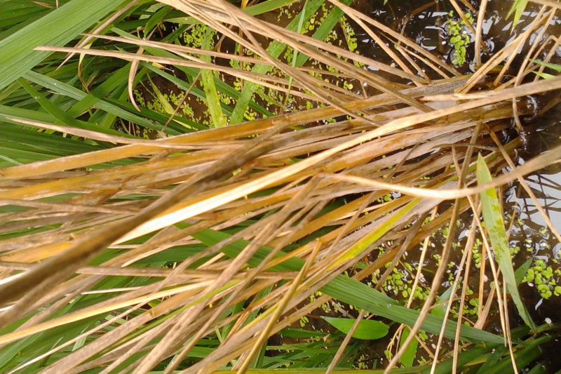 后期标志:在病株枯死后,靠近水面的茎秆上,有时可以看到一层淡红色或白色的霉状物,这是病菌的孢子。