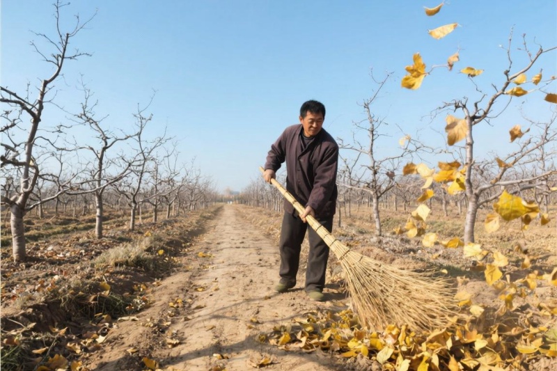 彻底清扫落叶:苹果落叶后至越冬前,仔细清扫园内所有落叶、落果,集中带出园外深埋或烧毁。千万不要把病叶堆在果园附近。