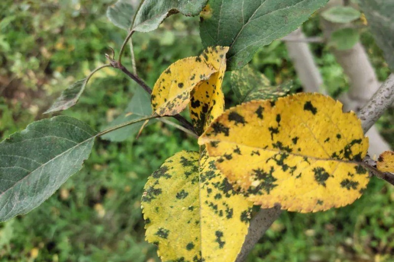 怎么看出生病了?初期在叶片正面出现深褐色小斑点,之后扩展成三种典型病斑:同心轮纹型、针芒型和混合型。共同特点是病斑周围叶片变黄,而病斑本身保持褐色,形成“绿岛”效应。严重时,病叶一碰就掉,导致果树提前大量落叶。