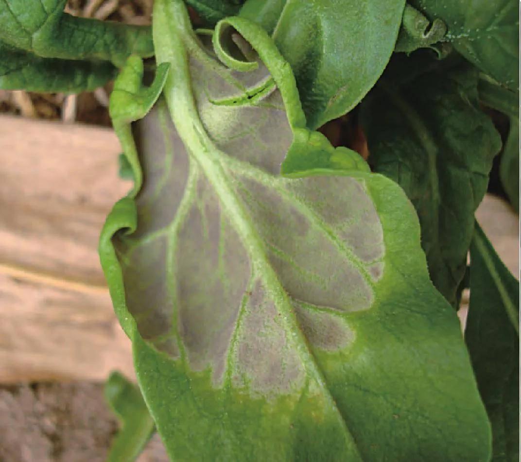这是菠菜的头号敌人,尤其在春末秋初、冷凉潮湿的季节最容易爆发。你首先会看到叶片正面出现一块块不规则的淡黄色斑点。关键识别点:把叶子翻过来,在对应的背面,能看到一层疏松的、像绒毛一样的紫灰色霉层。湿度越大,霉层越明显。病情严重时,整片叶子会像被火烤过一样枯黄。