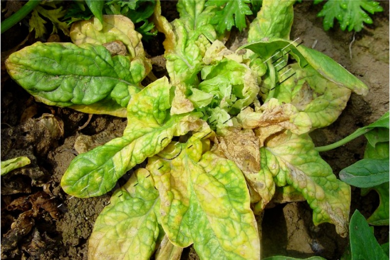 这个病不是由真菌引起的,而是由蚜虫传播的病毒。得病的菠菜最明显的特征就是长不大,整体矮缩。新长出来的叶子皱皱巴巴、凹凸不平,或者出现黄绿相间的“花叶”状。叶片也会变窄、变脆,甚至向上卷曲。