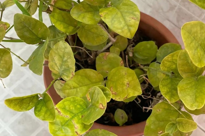 原因:九成是土壤偏碱或缺铁。北方水质偏硬,容易导致这个问题。